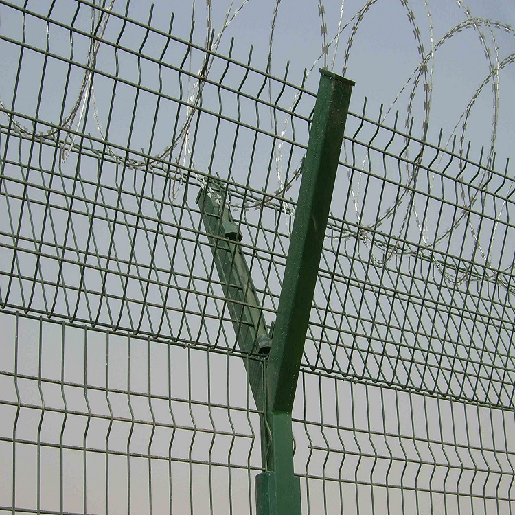 民用機場圍界頂部需加刺絲滾籠或刀片刺網等防攀爬設施,機場作為高安全場所之一,需要這種強度和安全防御性級別高的圍界設施,一般是是由V型支架立柱,加強型焊接片網和熱鍍鋅刀片刺網組成,使用安全防盜銜接件連接。民航局對機場圍界的部分技術指標要求進行了優化,如防腐年限要求從5年提升到8年,豎筋或邊框下端距地梁或地面距離≤50mm提升到≤30mm。