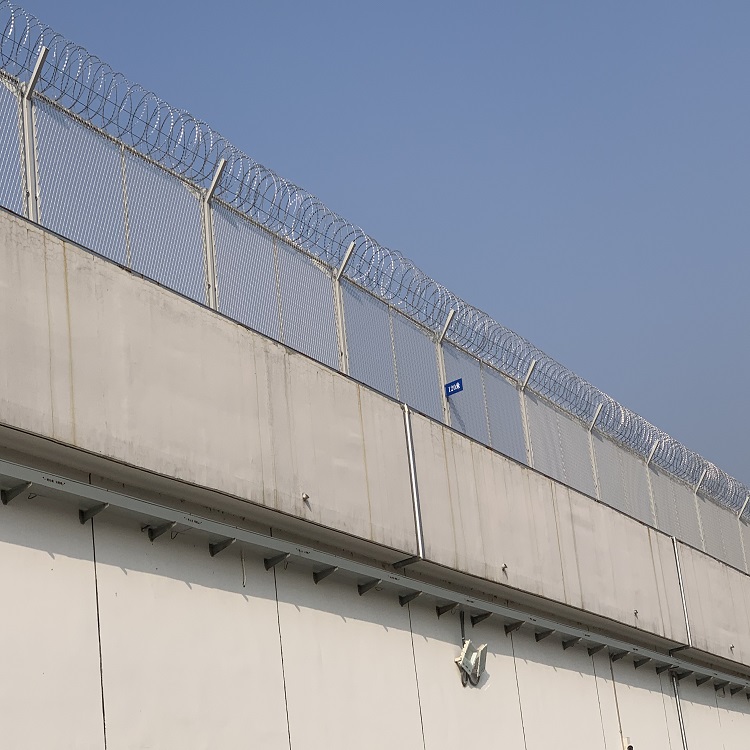 監墻外側防攀爬金屬隔離網@監區防攀爬金屬隔離網@監獄防攀爬金屬隔離網,通常由網片、立柱,加裝刀刺網圈組成,鋒利的刀片和適當的小孔形成了一道防攀爬高墻安全屏障,起到了很好的阻嚇作用。同時該產品還具有美觀、防阻效果好、施工便利等優點。