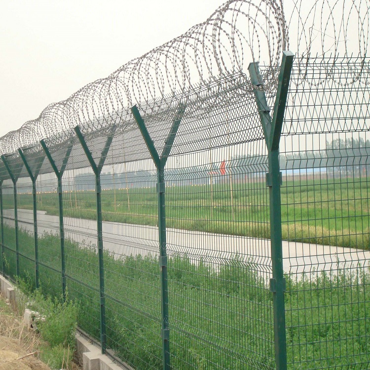 機場圍界網一般是由鋼筋焊接網、Y型防護立柱以及蛇腹式刀刺網等幾大主體組成,加上防盜安全連接件組成。