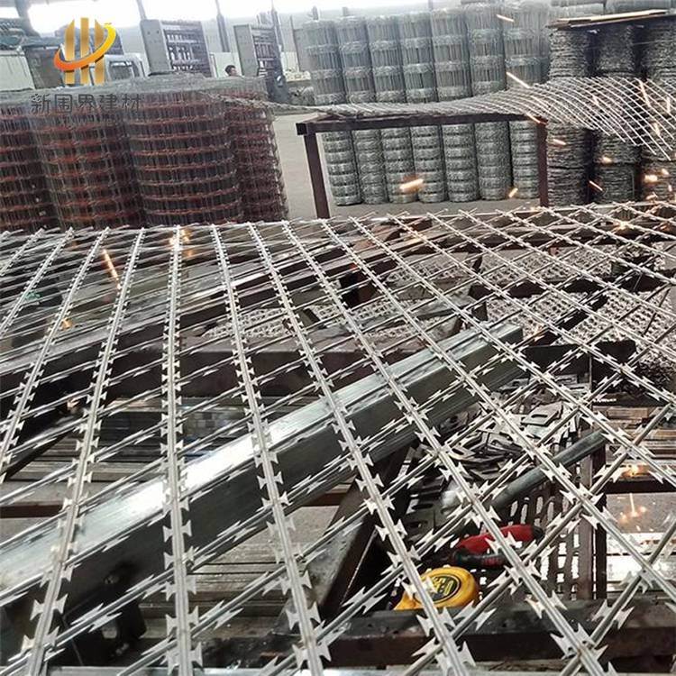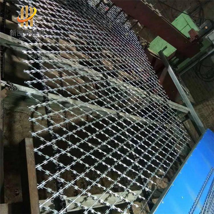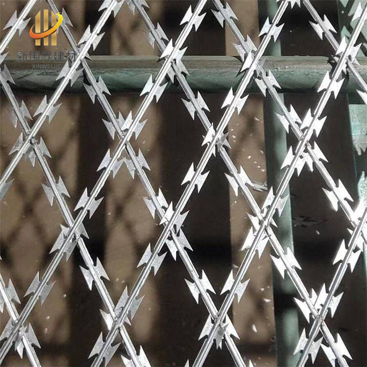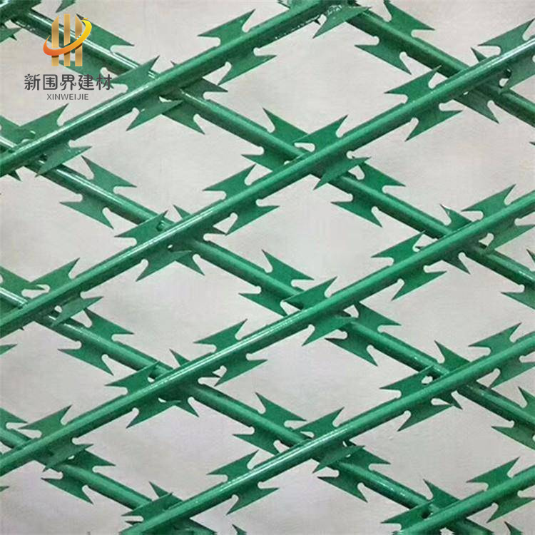 焊接的刀片刺網網片菱形狀刺網,至于上下螺旋刀片刺高安全防護特性特性,刀片刺網和蛇腹網結合使用,使人望而卻步,擊破人的僥幸心理。刀片刺網由銳利尖角鍍鋅鋼板或不銹鋼薄板做刀片,鋼絲做芯線組合而成的防護器。刀刺網的常用規格為:內絲2.5mm刀刺網有很好的隔離作用,防攀爬作用特別大。