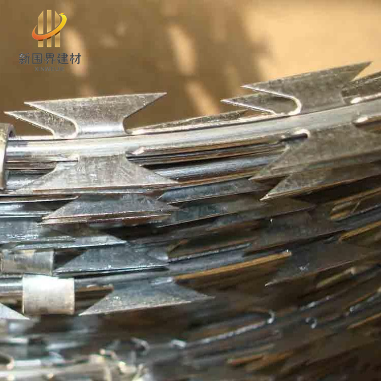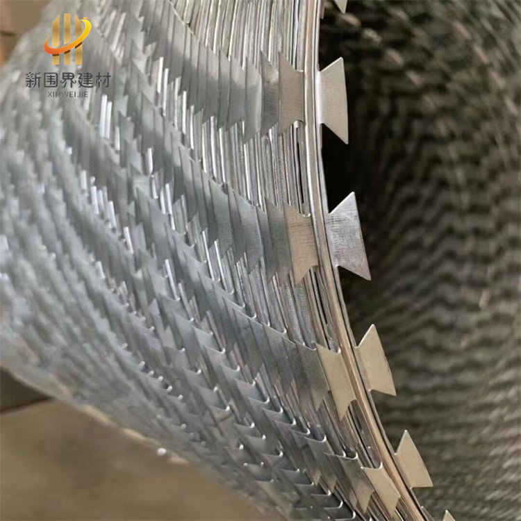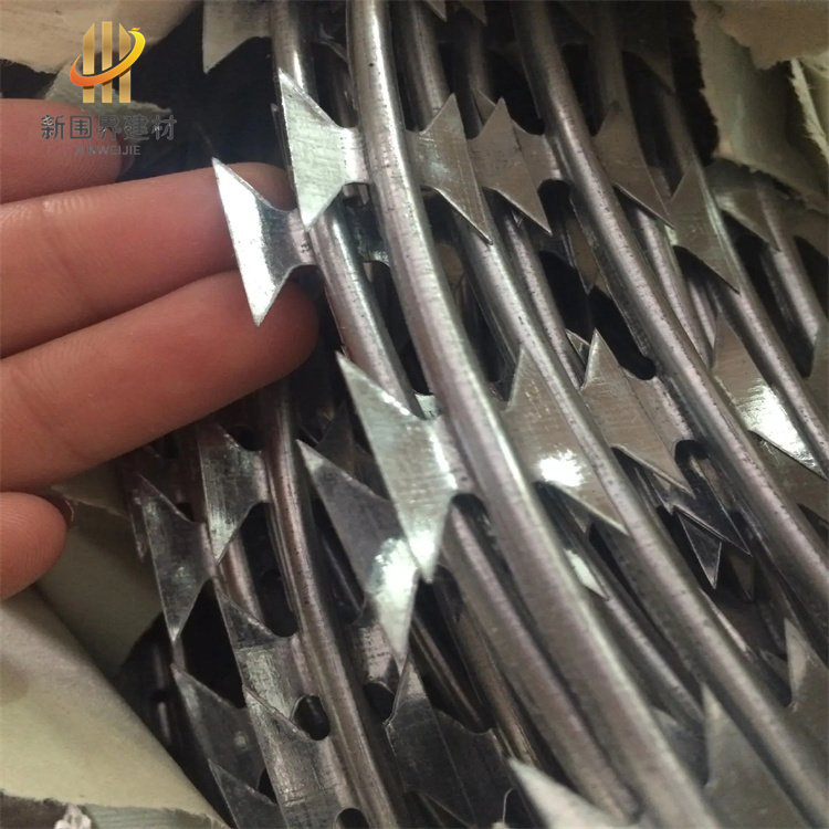 刀片刺網由熱鍍鋅鋼板或不銹鋼鋼板沖壓出尖銳的刀片狀,然后包裹熱鍍鋅絲或不銹鋼絲,組合成絕佳的防攀爬刺網。