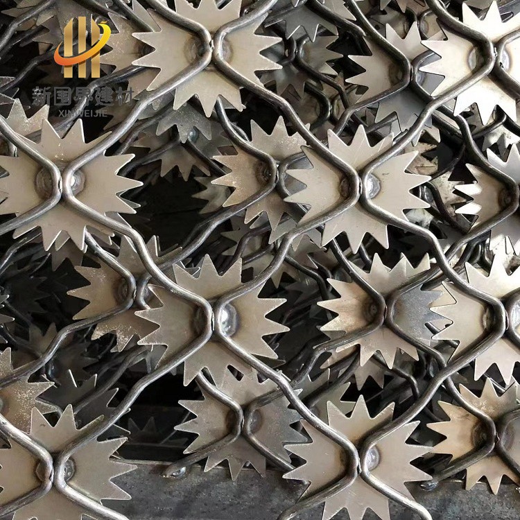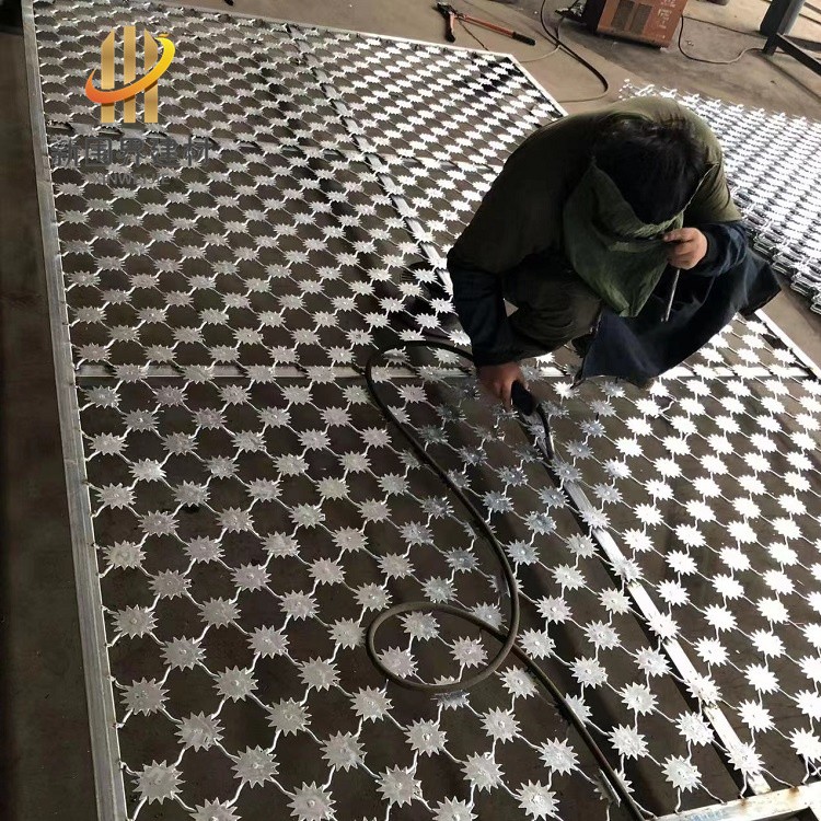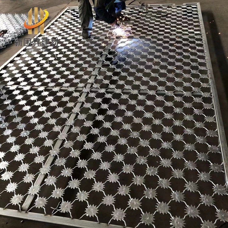 梅花刺網特點 :是用氬弧焊將梅花形刺片焊接在美格網的節點上,形成刺形保護,防止了手握腳攀。具有防攀爬、抗剪切、高安全防護性能。還具有美觀、實用、防阻效果好、施工便利等優點。