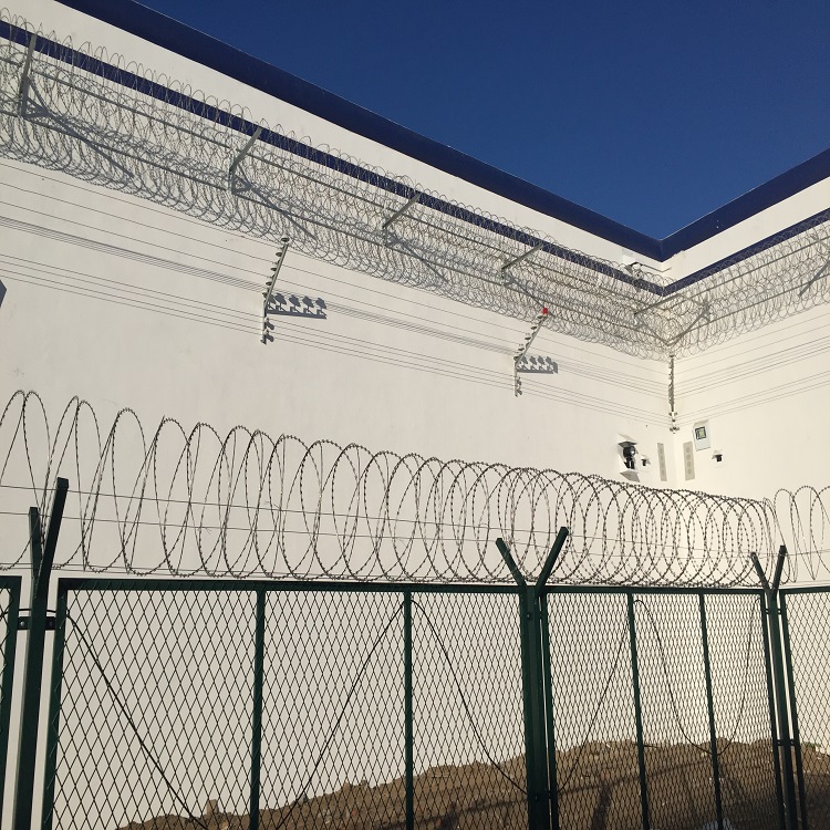 監獄鋼網墻、看守所隔離網、機場圍界網等,大多在頂部用V型支架加裝蛇腹形刺刀圈,這種刺刀圈呈螺旋狀,一般多為不銹鋼材質,結構新穎、堅固緊密、網面平整、網孔均勻、刀鋒銳利、防攀爬、抗腐蝕性強。