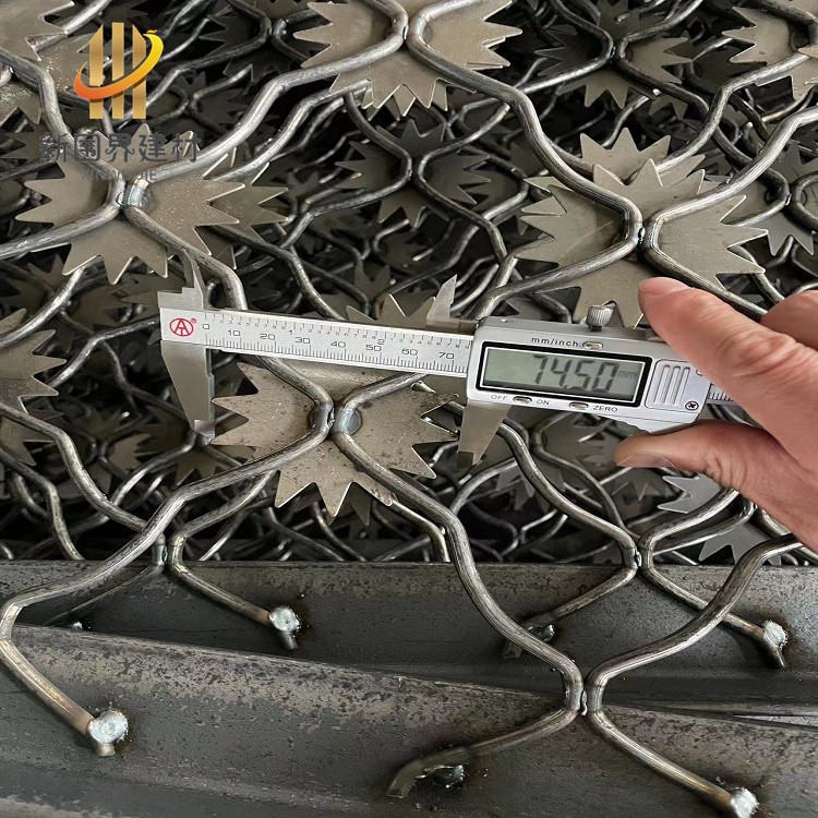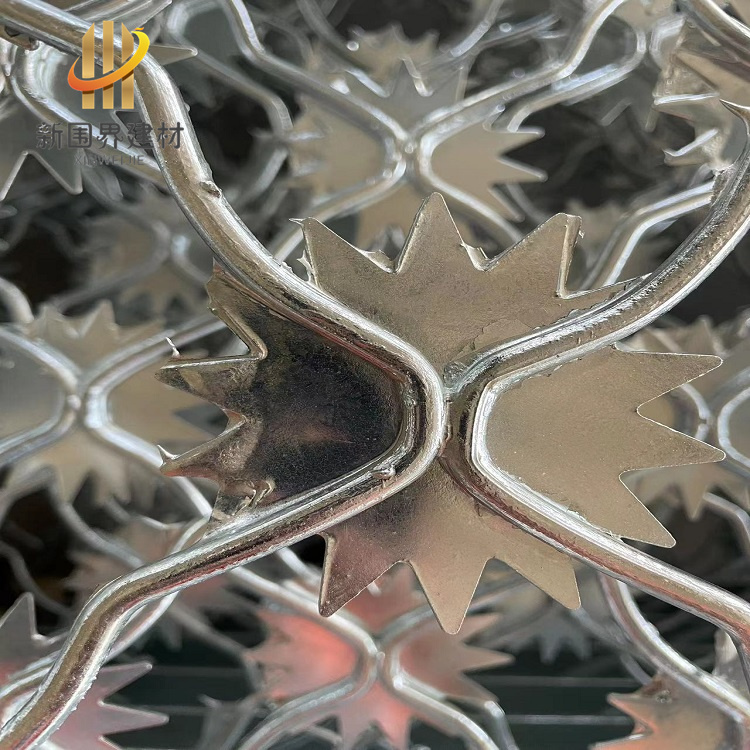 梅花刺片隔離網因其外形類似梅花得名,由于梅花刺片隔離網造形獨特不易觸摸,因而能達到很好的防護隔離效果。監獄梅花刺隔離網一般用于監獄大門,探監門,人員通道兩邊的隔離網,由于其成本造價高,所以還沒有廣泛替代普通焊接式隔離網。梅花刺片直徑不小于7.0cm,刺片厚1.2mm,采用Q235低碳鋼板沖壓成型。
