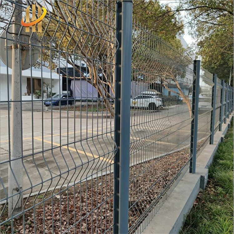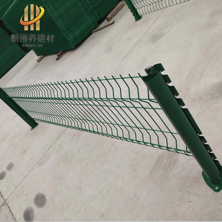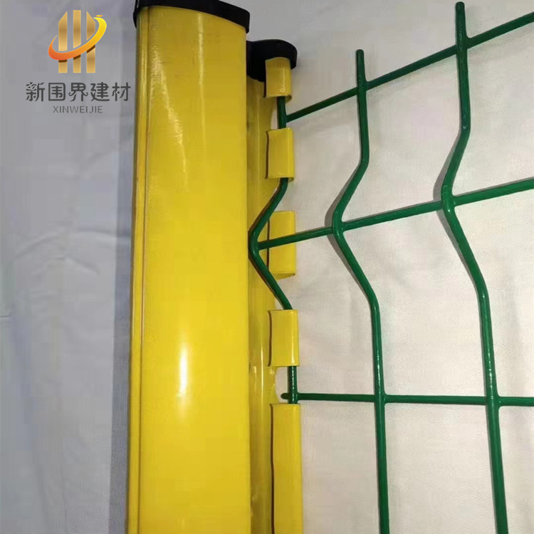 主體網片常以低碳鋼絲、鋁鎂合金絲為材料,編織焊接而成的一種隔離柵產品。該種護欄網的筒形為柱體,形狀為規則的半橢圓型,柱體的兩側面有若干凹口構成鉤板間的缺口,柱體上的掛鉤由缺口分為幾部分并沿柱體縱向均勻地分布于柱體兩側。掛鉤板內彎成拱型與橢圓型柱體的直邊相切,具有很好的防盜效果。