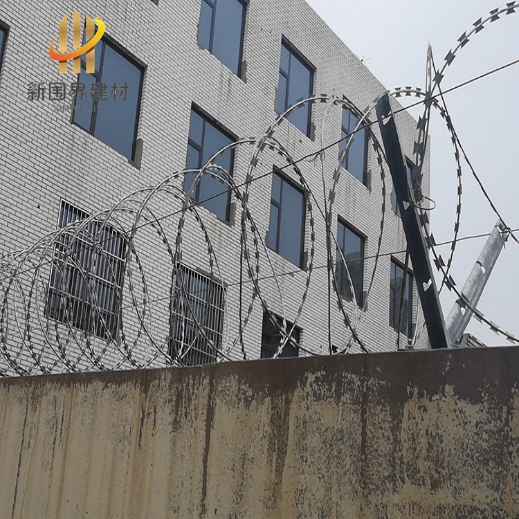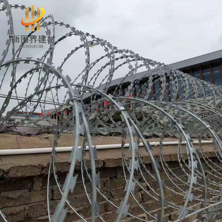 采用鋼板(刀板)沖壓成型包附于熱鍍鋅鋼絲(芯線)之上,由銳利尖角鍍鋅鋼板或不銹鋼薄板做刀片,高張力鋼絲做芯線組合而成的。刀片刺網具有美觀、經濟實用、防阻效果好、施工便利、應用廣泛等優異特點。