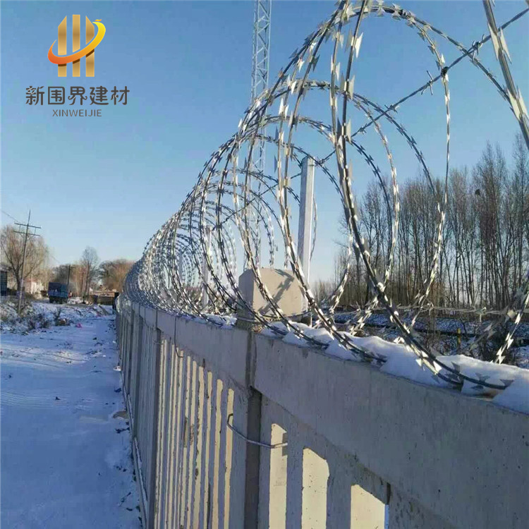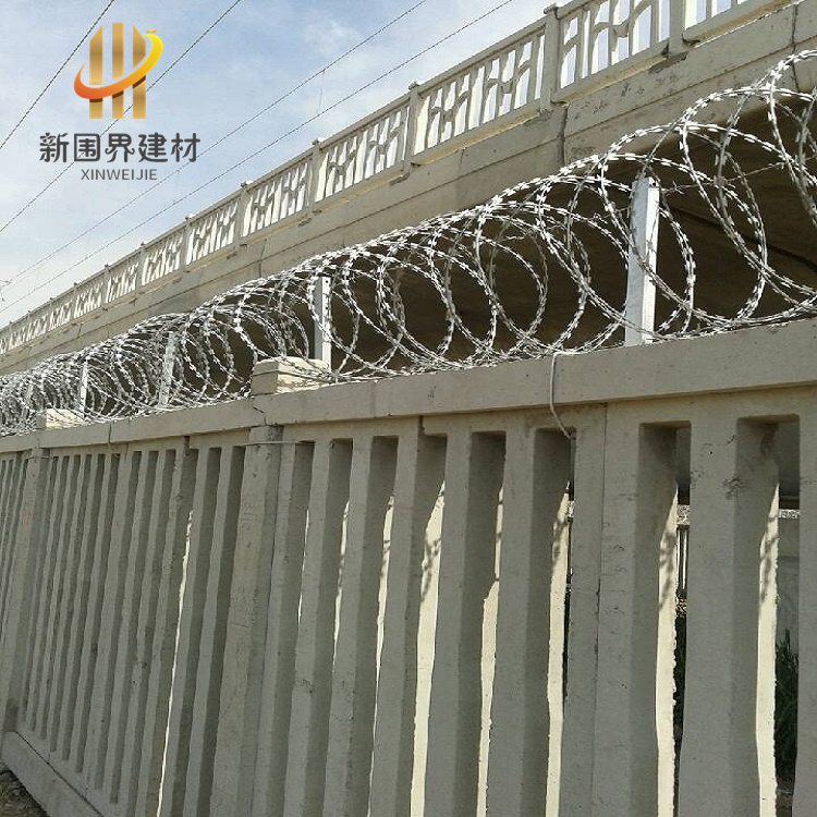 刺絲滾籠規定:鐵路柵欄一改往日焊接鋼絲網柵欄、刺絲網柵欄等產品,改為防御性更強、壽命更長久的:鋼筋混凝土柵欄+0.5米高刺絲滾籠的防護柵欄。