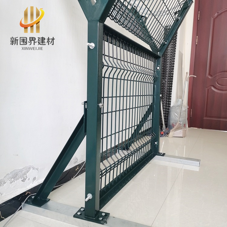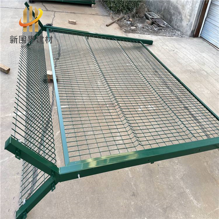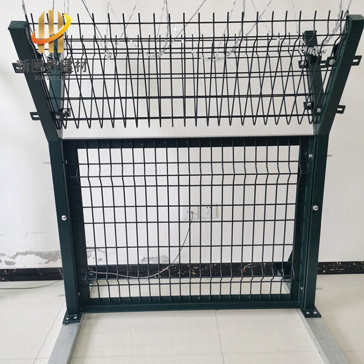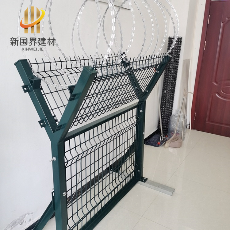 機場護欄網頂部加裝刀片刺絲、刀片刺網后又很好的增強了安全防護性能。采用電鍍、熱鍍、噴塑、浸塑等防腐形式,具有很好的抗老化、抗曬、耐腐蝕等特點。其產品造型美觀、花色多樣,既起到圍欄作用,又起到美化作用。由于具有安全性高、防攀爬能力好,網片連接方式采用特制SBS緊扣件,有效防止人為的破壞性拆卸,橫向四道折彎加強筋,使網面強度顯著增加。