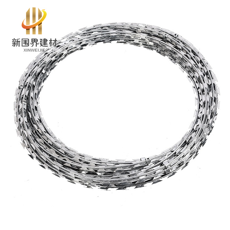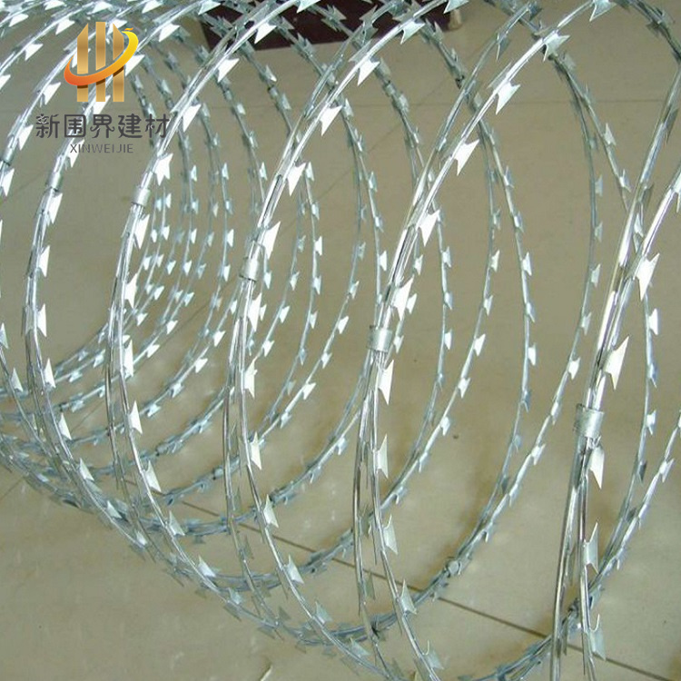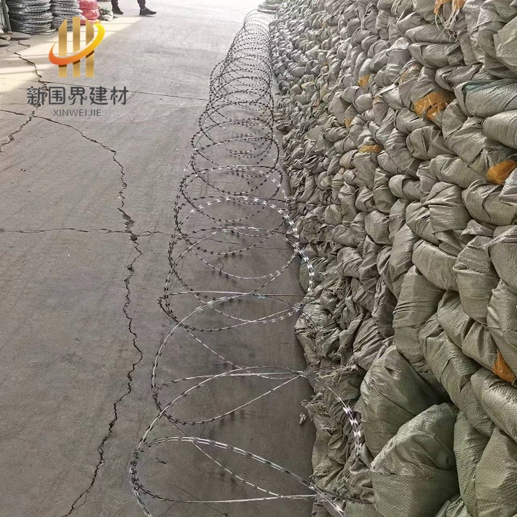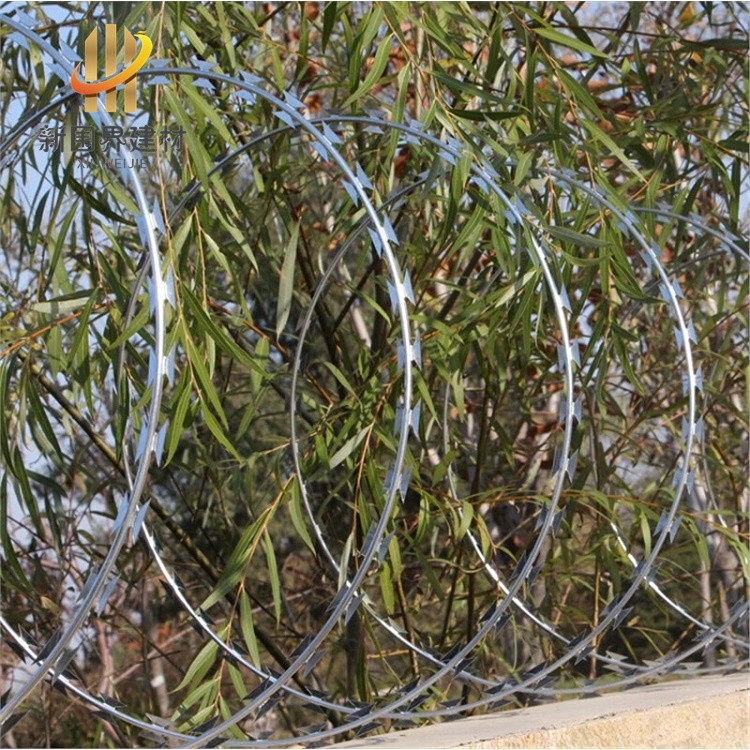 蛇腹型刀片刺繩又名刀片刺網或刮刀型刺網,是一種近年來防護、隔離能力較強的新型產品。刀片耐用及耐腐蝕性的熱鍍鋅鋼板或不銹鋼板做材料,由專用機械包附與熱鍍鋅高碳鋼絲或不銹鋼絲做的芯線上。由于有著鋒利美觀的刀片刺、高強度的芯線,使本產品綜合了防阻效果好、難破壞、安裝美觀方便快捷、耐老化等諸多優點。