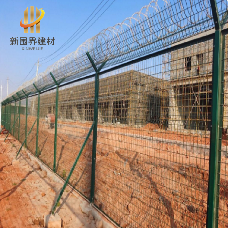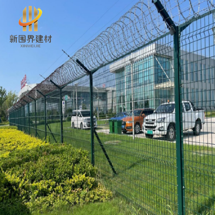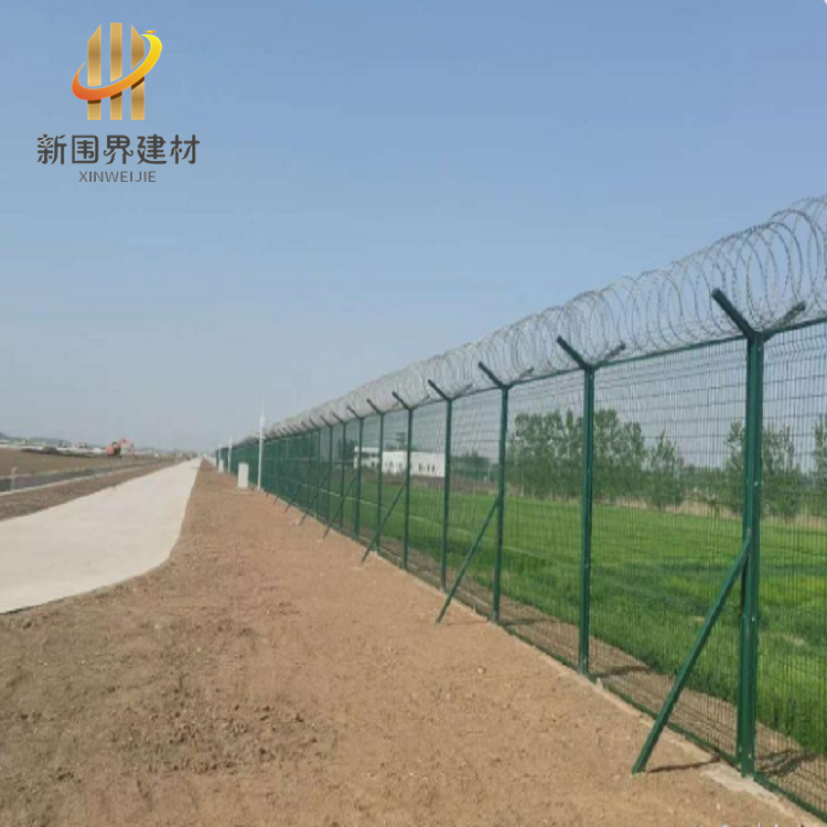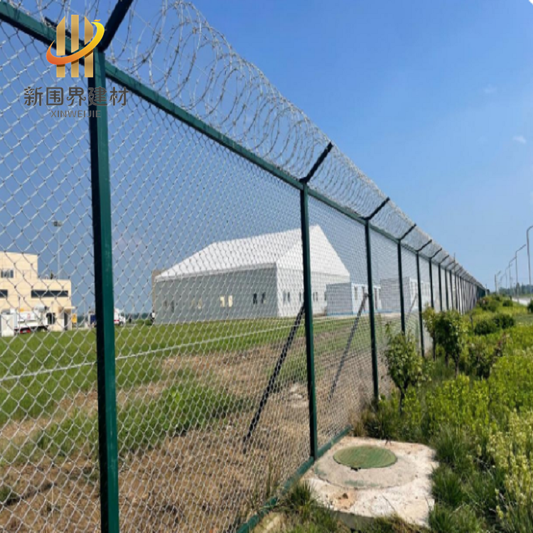 機場圍界是由Y型立柱、加強型焊接網片、安全防盜連接件和熱鍍鋅刀刺滾籠組成安全防御性級別很高的隔離網產品。機場圍界表面采用電鍍、熱鍍、噴塑或浸塑等防腐形式,具有良好的抗腐蝕、抗曬、抗老化的優點。其造型美觀,既安全作用又有美觀作用。被廣泛應用在機場、監獄、軍事基地等高安全場所。