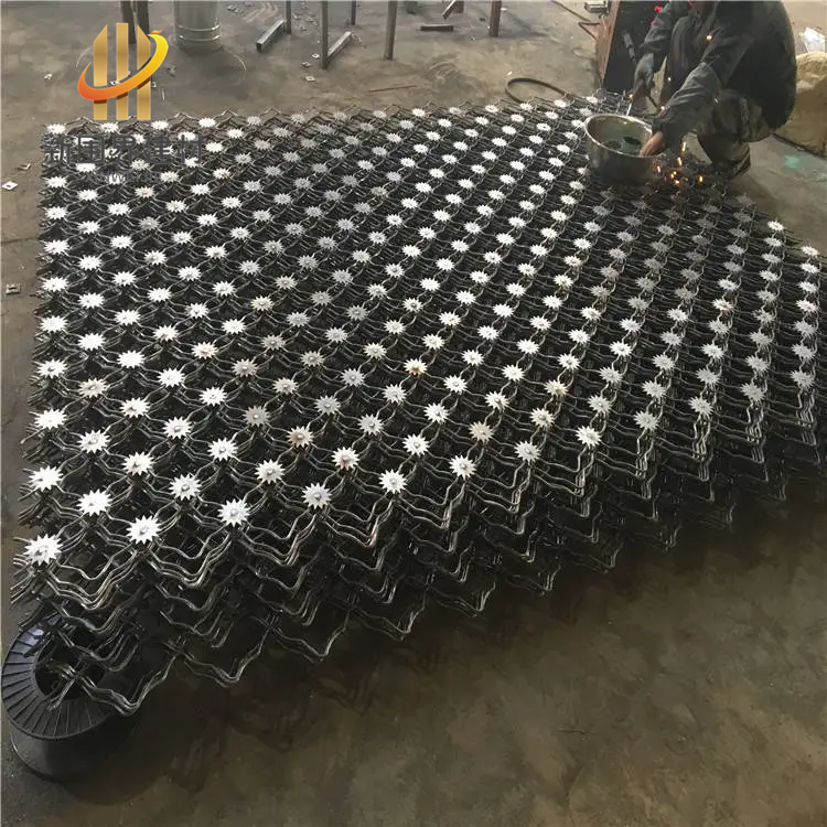 梅花刺隔離網的立柱通常采用80*80*3mm方管,網片根據高度可分為一片式結構也可分上下兩層結構,邊框:40*40*2.0mm低碳鋼矩形管,中間加一根豎向支撐。絲徑為5.0m,網孔 100*100m,刺片直徑75,厚度為 1.2mm,將網絲、刺片、方管焊為一體,邊框與立柱通過邊耳無縫連接,采用不銹鋼專用防盜螺栓連接,頂部刀片滾刺網采用型號BTO一22,芯絲直徑2.5mm。刀長22m,刀寬15m,厚度0.5m,刀間距 35m。雙螺旋,直徑中600m,密度 10 圈/米,圈距排列均勻,相鄰每圈間距不大于200mm。材質采用不銹鋼 304。