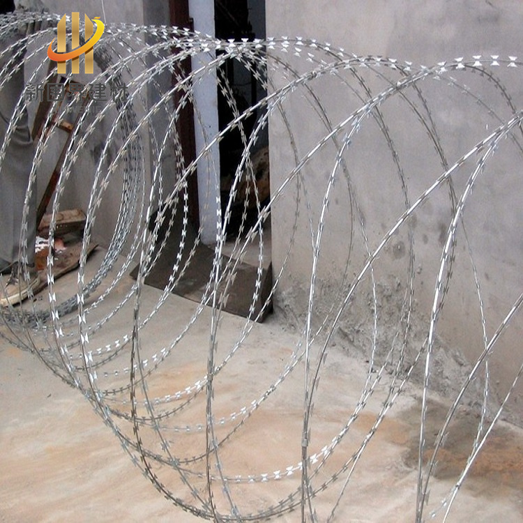 刀片刺網由熱鍍鋅鋼板或不銹鋼薄板沖壓出尖銳的刀片狀,高張力鍍鋅鋼絲或者不銹鋼絲做芯線組合而成的阻絕器材。由于刺網造形獨特不易觸摸,因而能達到極好的防護隔離效果。產品的主要材質有鍍鋅板和不銹鋼板。
