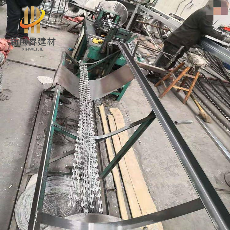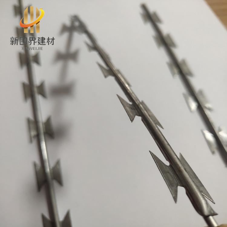 它采用鋼板沖壓成型包附于鋼絲之上,由銳利尖角鍍鋅鋼板或不銹鋼薄板做刀片,高張力的鋼絲做芯而組合成的。