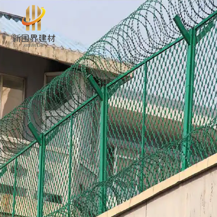 而現在最新的鋼網墻大多數采用菱形孔焊接刀片刺網,與雙螺旋刀片刺網結合,由V型支架立柱組成。隔離防護效果更好,可以應用在巡邏道、監區內、放風場、哨所等高安全場所。