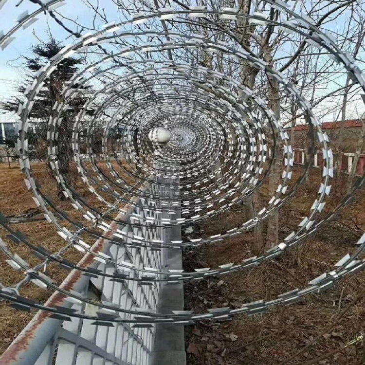 監(jiān)獄刀片刺繩一般用于監(jiān)獄做防護(hù)用,因刀片鋒利不易觸摸,起到一定的嚇阻作用那個(gè),刀片刺繩,用途比較廣泛,他可以用于居民的墻體防護(hù),也可以用來(lái)圈地等,該刺繩防盜效果比普通刺繩要好,價(jià)格也不高,所以刀片刺繩越來(lái)越應(yīng)用廣泛。