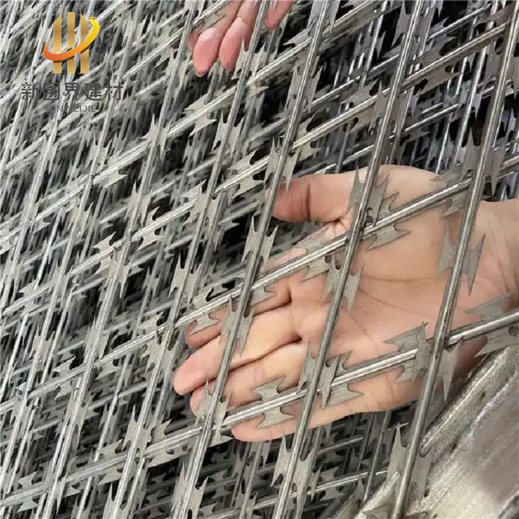 由鍍鋅鋼板/不銹鋼薄板沖壓成刀片,纏繞在鋼絲芯線上,通過焊接形成菱形或方形網(wǎng)孔結(jié)構(gòu),網(wǎng)孔規(guī)格常見為50×100mm、75×150mm,網(wǎng)片高度通常為2-3米,邊框采用扁鐵加固,刀片鋒利密集,無法徒手握持或攀爬,有效阻止強行翻越。