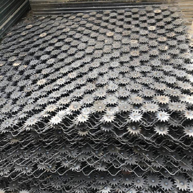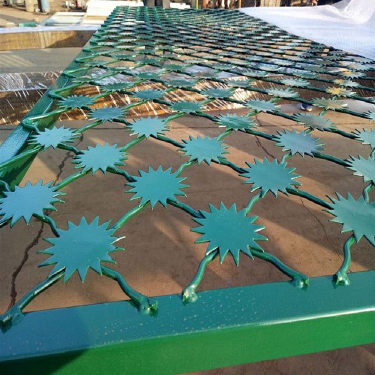 梅花刺隔離網網直徑小于7.5cm,刺片厚度大概為1.2mm厚,采用q235低碳鋼板沖壓成型。梅花刺隔離網網片為菱形網孔,網格尺寸:10*10cm(高*寬),網絲直徑大概為5mm,采用s195線材高壓焊接,每一個焊點都會有一個梅花刺。刺型防攀爬安 的立柱采用q235鋼管,直徑114圓管,壁厚4mm;立柱頂部直接焊接外徑140mm、厚度6mm法蘭盤方式;預留四只直徑16mm絲孔,與電網支架末端法蘭盤相對應。梅花刺隔離網立柱法蘭盤和支架法蘭盤分別整體熱鍍鋅處理。立柱高4.5米,間距3米,立柱頂端全部做防水處理。每根立柱與法蘭盤連接處(與隔離網垂直兩面)焊接100mm*80mm*5mm四個三角支撐,大門兩側的立柱支撐筋骨直角邊長為120mm*100mm 。