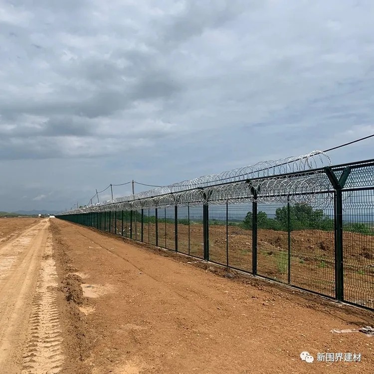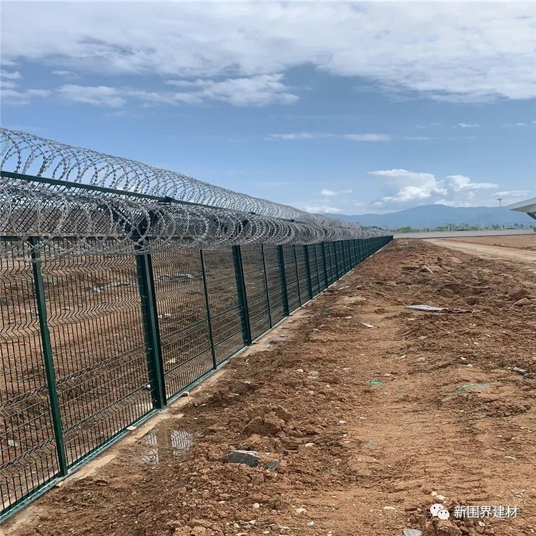 機場圍界網是由V型支架立拄,加強型焊接片網,安全防盜連接件和熱鍍鋅刀片刺籠組成,是強度和安全防御性級別很高的護欄網產品。