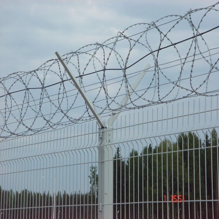 立柱規格:Y型柱直徑60mm×60mm×2.5mm空心方鋼、地上高度2400mm、地下高度400㎜;蛇腹型刀刺網V型托長度分別為700mm。