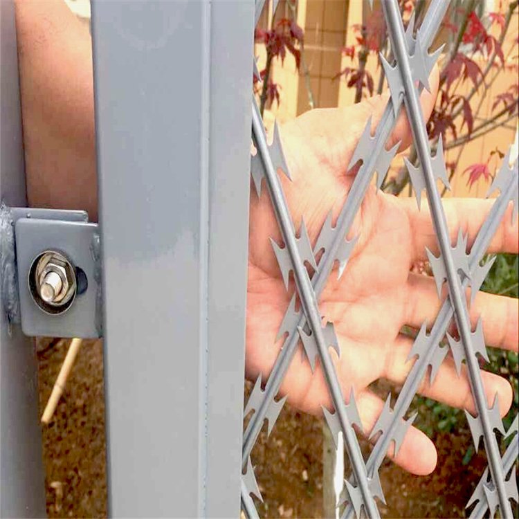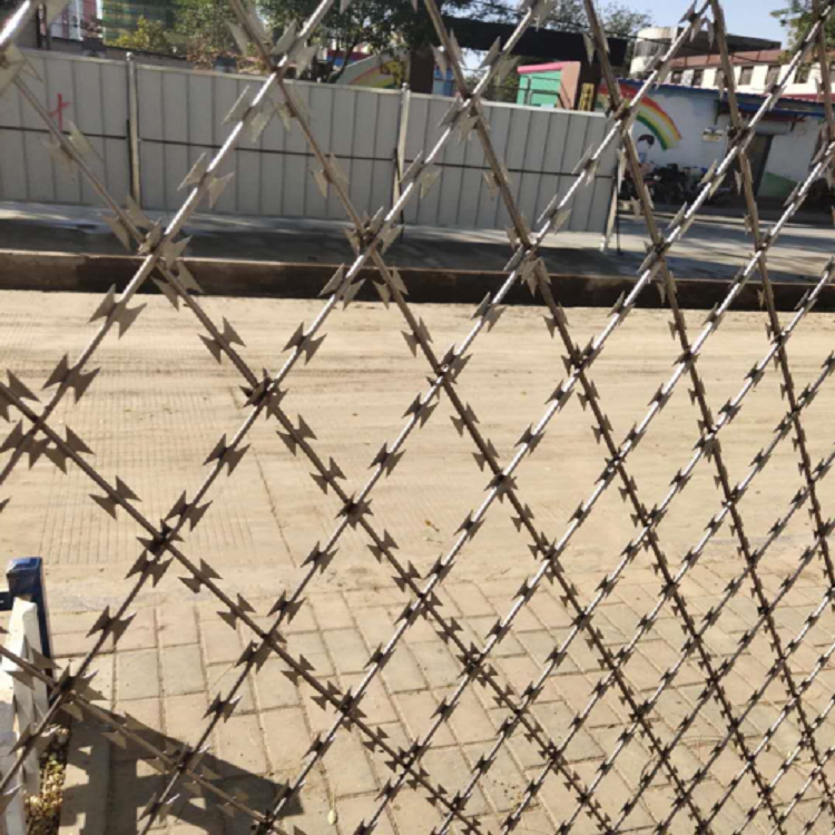 監獄防攀爬網是把刀片刺絲焊接成菱形孔或者方形孔的刀片刺網,如果想攀爬翻越,網狀的刀片刺網刀片鋒利,手不能握,腳不能攀登,堅決阻止人逾越的防護墻,具有很強的恐嚇和阻止效果,既美觀又實際效果顯著,深受監獄、軍隊、政府設施的喜好。