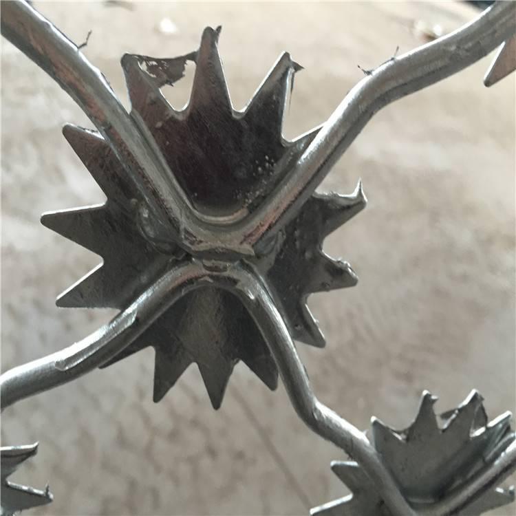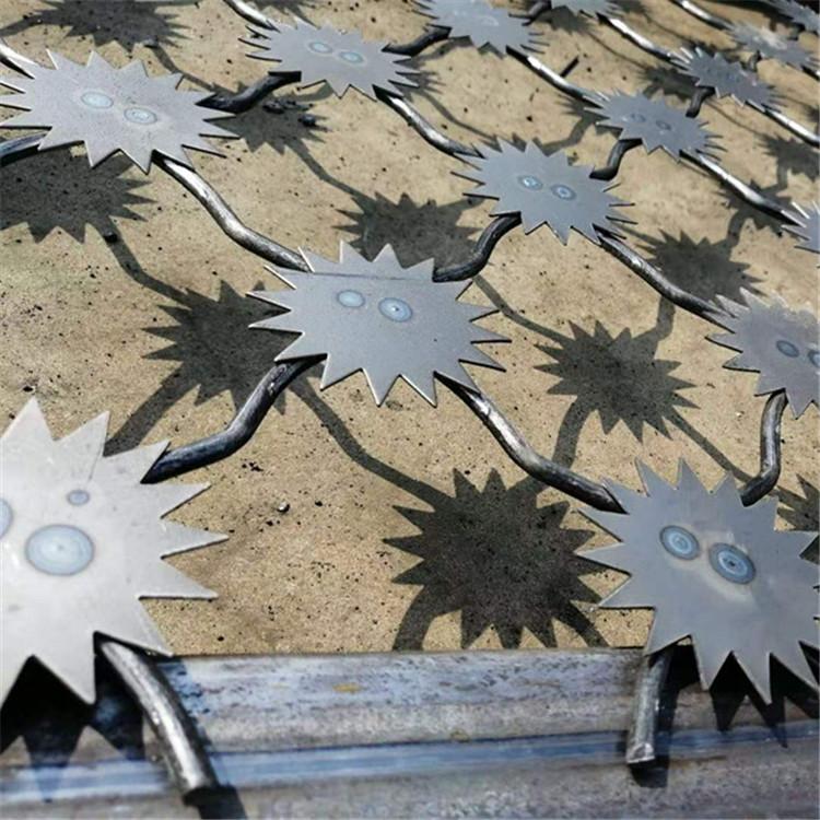 梅花刺片隔離網(wǎng):是用氬弧焊將梅花形刺片焊接在美格網(wǎng)的節(jié)點(diǎn)上,形成刺形保護(hù),有效的防止了手握腳攀。