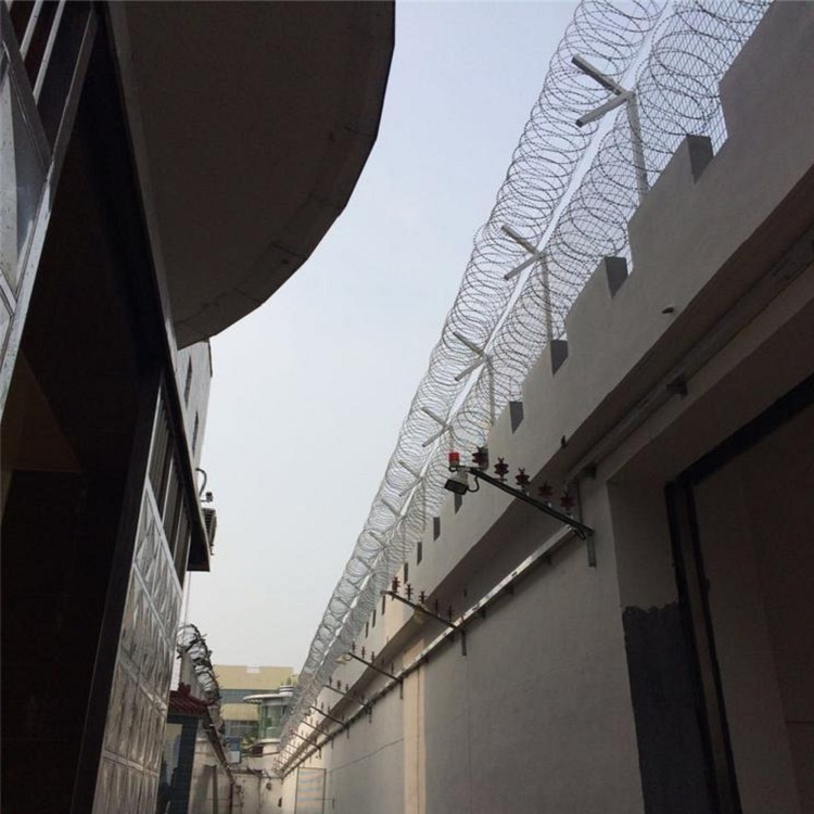 在鋼網墻頂部加裝刀片刺絲、刀片刺網后又很好的增強了安全防護性能。