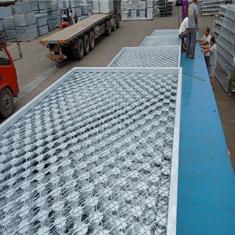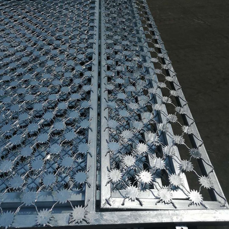 是用氬弧焊將梅花形刺片焊接在美格網的節點上,形成刺形保護,有效的防止了手握腳攀,為此該網開始在監獄或看守所使用。材質一般為不銹鋼材料,也有的采用熱鍍鋅、后熱鍍鋅或者浸塑防腐處理。