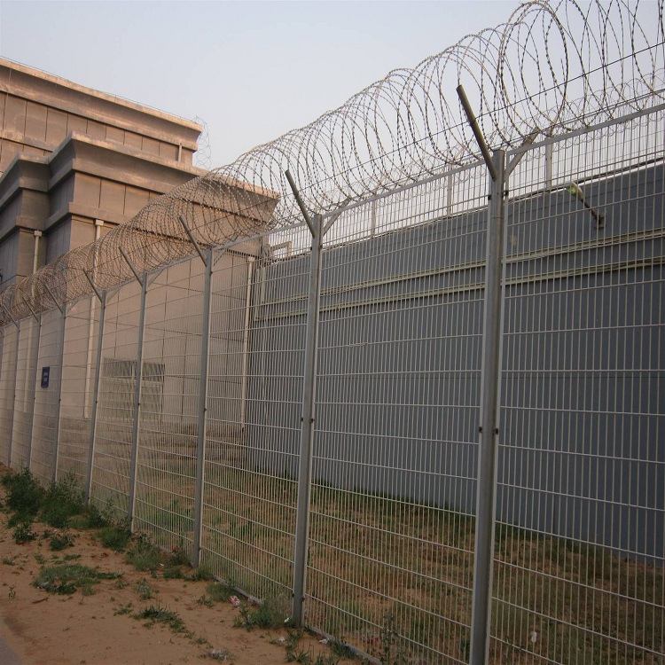 產品特點:立柱采用60*60方管,壁厚2.0mm,焊接成Y型,表面浸塑處理,網片高度2000mm-3000mm,長度2500mm-3000mm,,V型頂端安裝刀片刺網,直徑采用50cm-60cm,刀片刺網主要是由熱鍍鋅鋼板或不銹鋼薄板沖壓而成的,它擁有尖銳的刀片,高張力鍍鋅鋼絲或者不銹鋼絲做芯線組合而成的產品。由于刺網的形狀很特別,而且每個角度都有尖狀刀片,因而能好的防御保護效果。