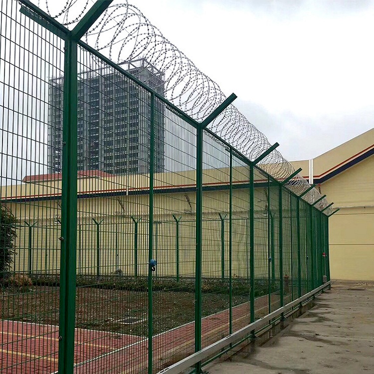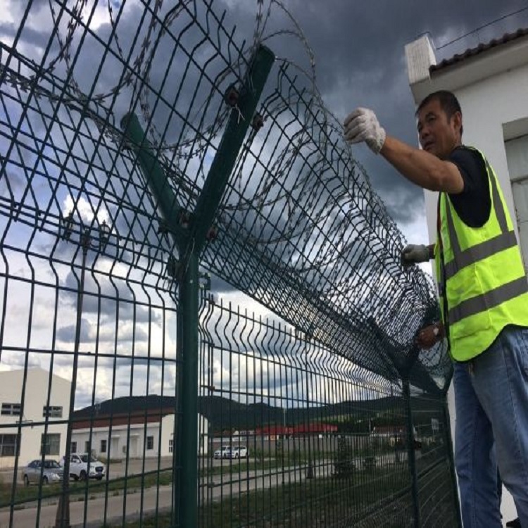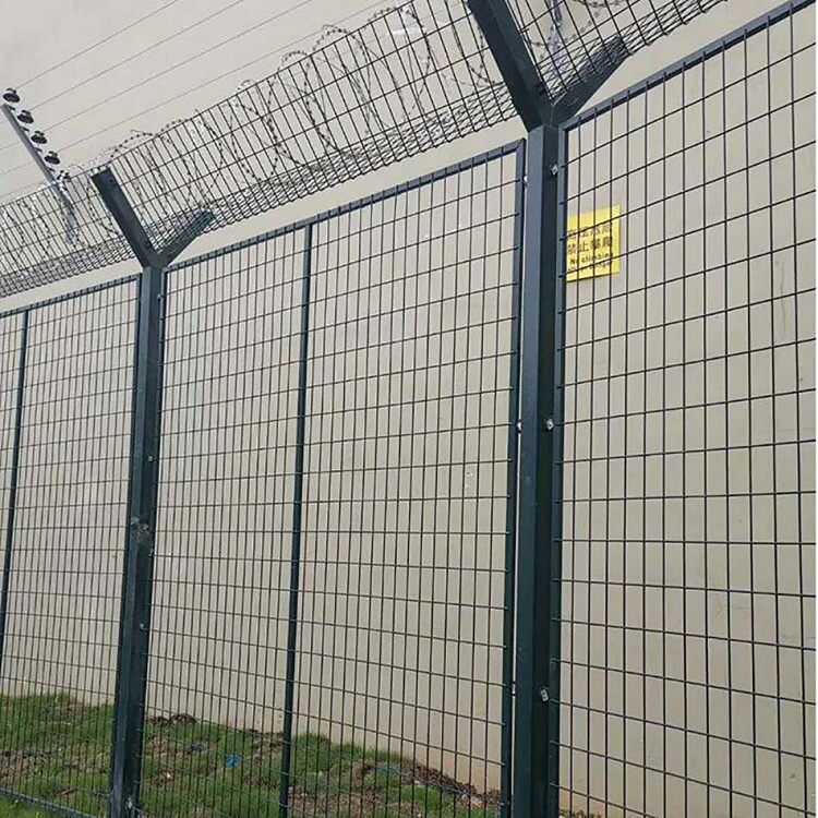 機場Y型安全防御護網是由V型支架立柱,加強型焊接片網,安全防盜連接件和熱鍍鋅刀片刺繩組成強度和安全防御性級別很高。近年來,被廣泛應用在機場,軍事基地等高安全場所。注:如果在機場護欄網頂部加裝刀片刺絲、刀片刺繩后又很好的增強了安全防護性能。采用電鍍、熱鍍、噴塑、浸塑等防腐形式,具有很好的防老化、防曬、防候等特點。其產品造型美觀、花色多樣,既起到圍欄作用,又起到美化作用。由于具有安全性高、防攀爬能力好,網片連接方式采用特制SBS緊扣件,有效防止人為的破壞性拆卸,橫向四道折彎加強筋,使網面強度顯著增加。