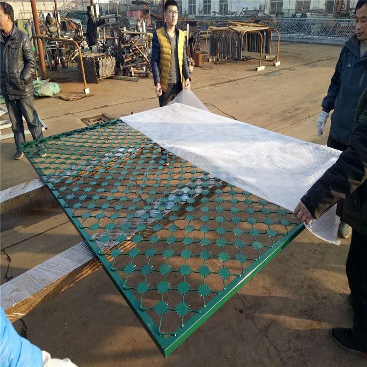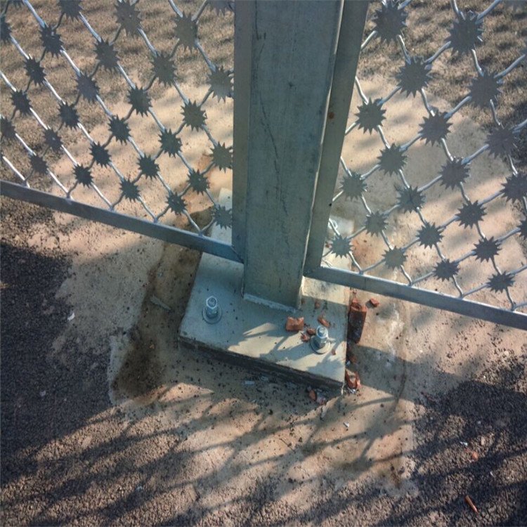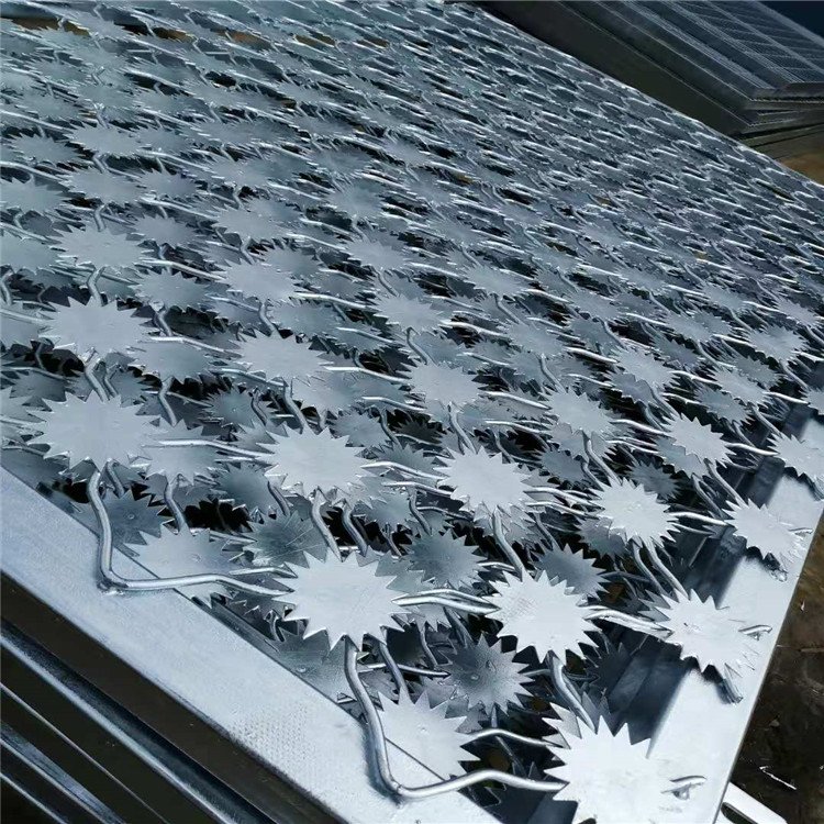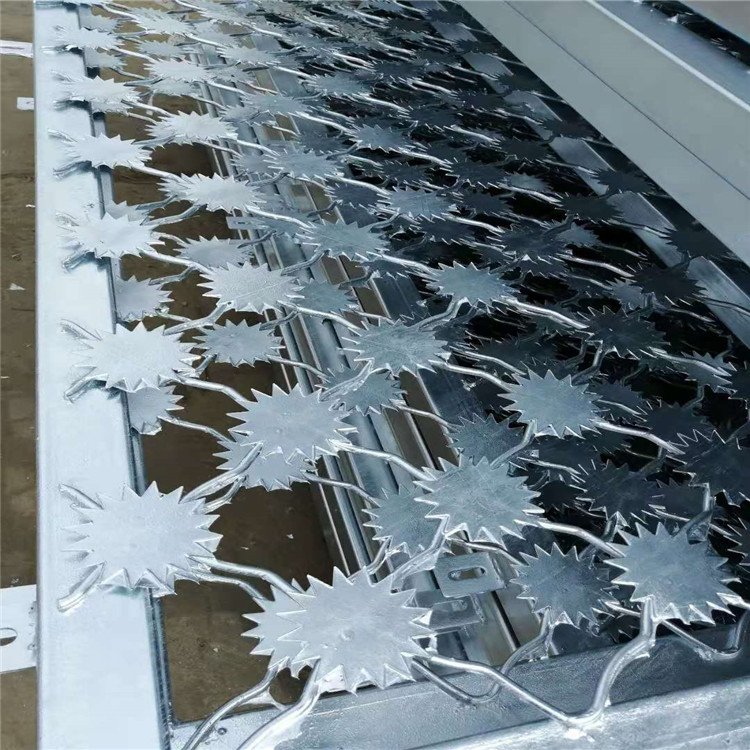 1、梅花刺片:梅花刺片直徑不小于7.5cm(直徑6cm、7cm、8cm),刺片厚1.5mm,采用Q235低碳鋼板沖壓成型。梅花刺片用氬弧焊將梅花形刺片焊接在美格網的節點上,形成刺形保護,有效的防止了手握腳攀。