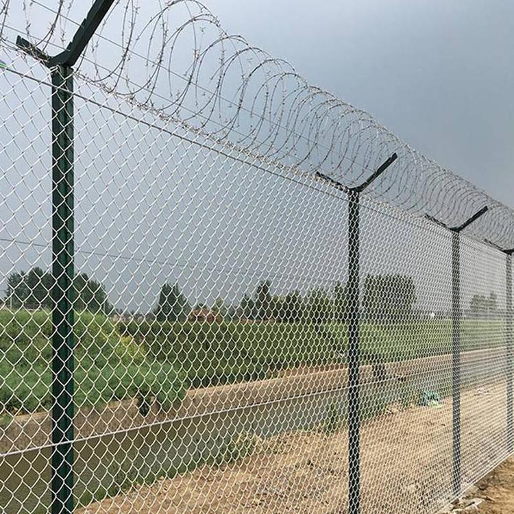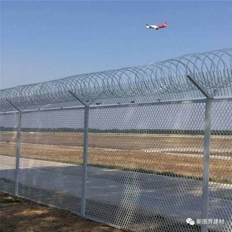 機場飛行區圍界采用物理圍界阻隔(如單/雙層金屬圍欄或磚墻并附加圈刺滾籠等),在這里我們詳細說明一下飛行區圍界阻隔網,機場物理圍界圍墻要求物理圍界內側、外側的凈高度應不低于2.5m,離地間隙不大于3cm。其中頂部防攀爬設施采用刺絲滾籠或刀片刺網等結構的圍欄(墻)。