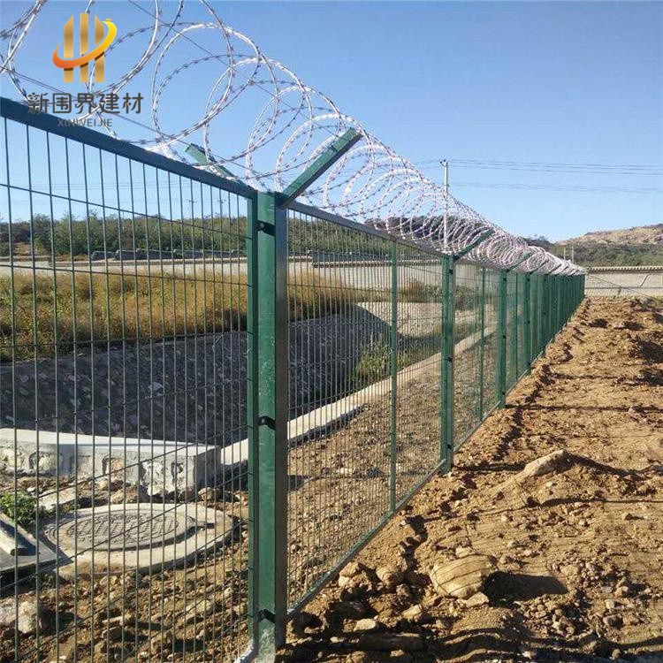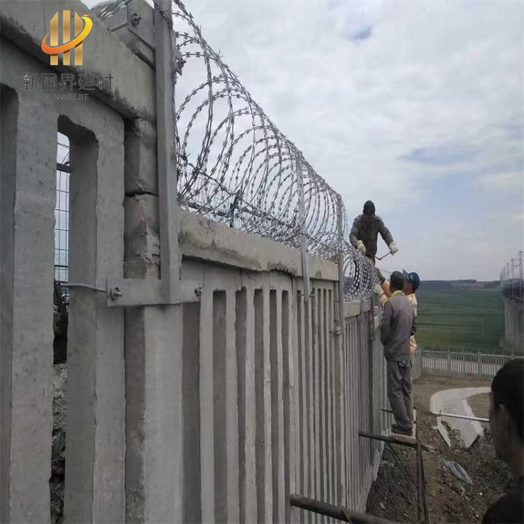 2、與護欄配套使用:護欄立柱焊接成Y型,頂部配有大V型網片,V型網片的作用與上邊鍍鋅絲的作用一致,有連接加固和承托作用。先把護欄立柱與網片安裝好,裝上V型網片再與立柱連接,然后上刀刺,安裝刀刺時一定要小心,這個過程必須要有2個人來完成,有一個人拿鉗子把卡扣刀刺與網片連接,第二個人負責拉著一頭往前走,一邊拉一邊卡扣,一般一卷刀刺能拉8米--10米的距離。
