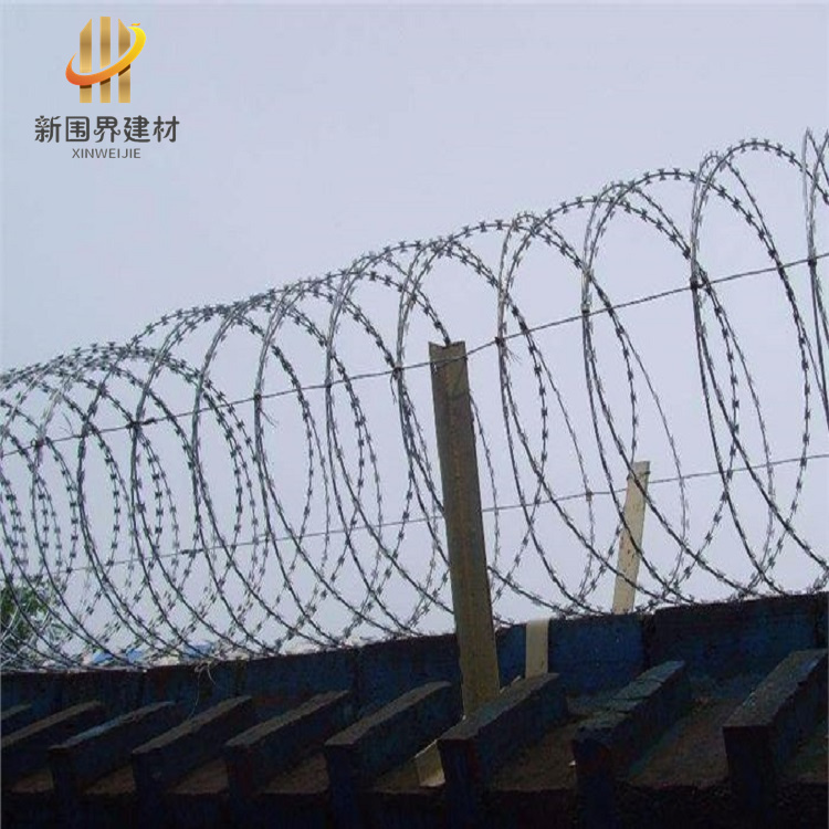 1、刀刺滾籠單獨使用時:主要是與混凝土實體墻結合使用,有專門配套的V型或者Y型支架,底部焊有法蘭盤打膨脹螺絲與墻體固定。支架上焊接鐵絲小勾卡槽用來固定鍍鋅絲,鍍鋅絲的作用是用來承托起蛇腹型刀刺,那U型卡扣與蛇腹型刺絲滾籠相連。因為每個支架的間距為2.5--3米,這中間如果沒有鍍鋅絲,刺絲滾籠會下垂,達不到理想安裝效果。