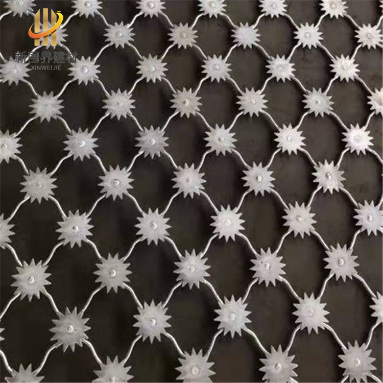梅花刺網(wǎng)又稱高安全防護網(wǎng)、防護網(wǎng),是用氬弧焊將梅花形刺片焊接在美格網(wǎng)的節(jié)點上,形成刺形保護,防止了手握腳攀,為此該網(wǎng)開始使用。