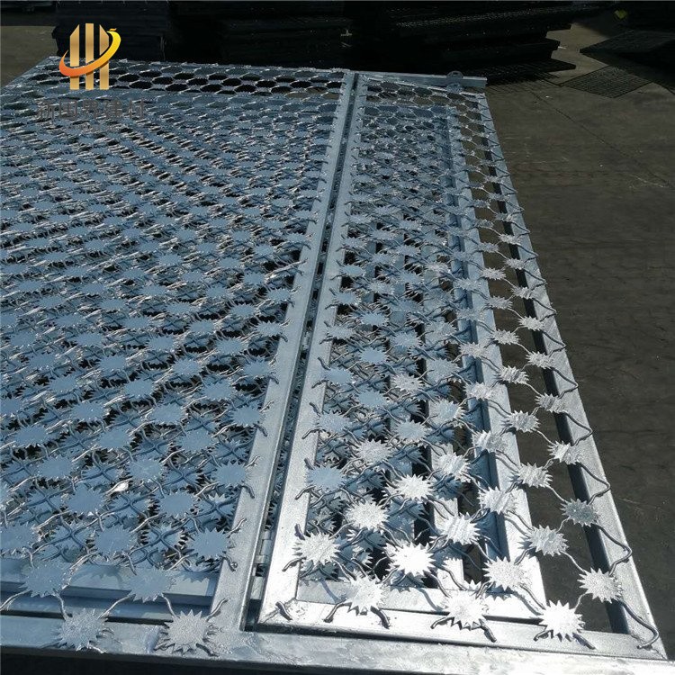 為單層梅花刺片網,直徑不小于7.5cm,刺片厚1.5mm,采用Q235低碳鋼板沖壓成型。網片為菱形網孔,網格尺寸:120mm*110mm(高*寬),網絲直徑8mm,采用S195線材高壓焊接,每一個焊點附焊梅花刺一個。