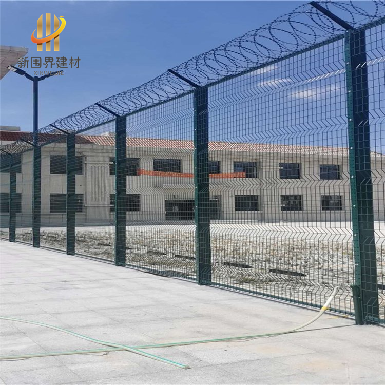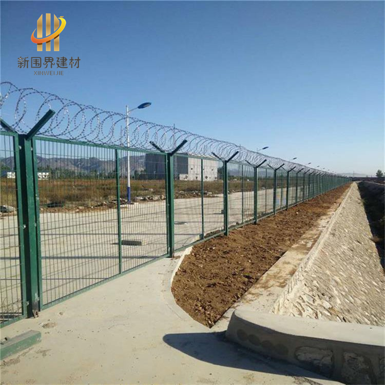 立柱焊接成Y型,表面浸塑處理,網片高度2000mm-3000mm,長度2500mm-3000mm,,V型頂端安裝刀片刺網,直徑采用50cm-60cm,刀片刺網主要是由熱鍍鋅鋼板或不銹鋼薄板沖壓而成的,它擁有尖銳的刀片,高張力鍍鋅鋼絲或者不銹鋼絲做芯線組合而成的產品。