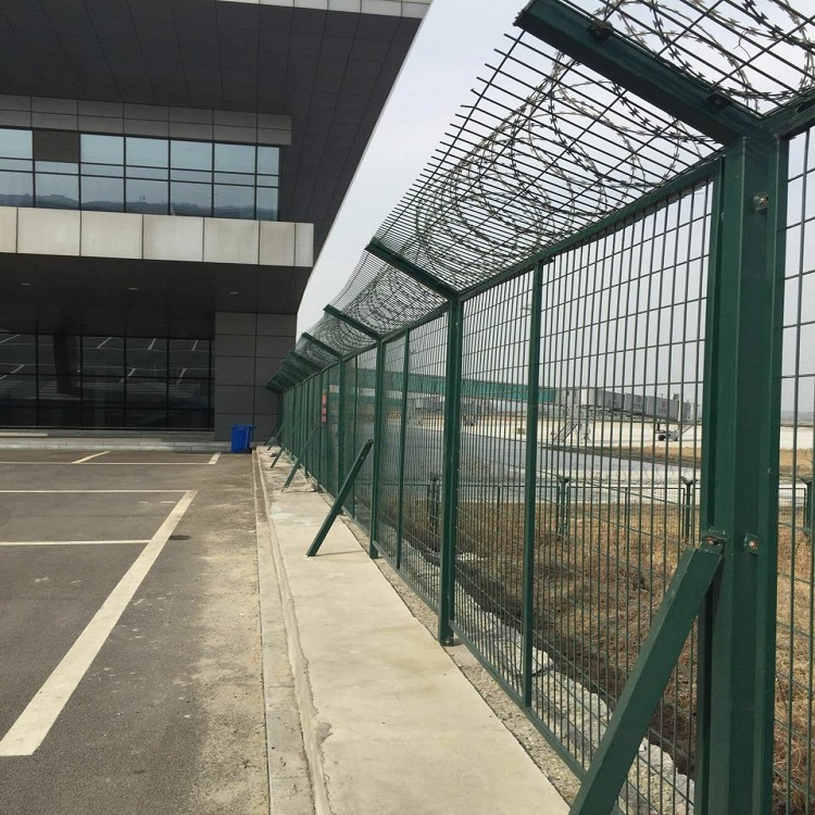 機場圍界網是一種高安全隔離防護網,這種新型隔離網一般由鋼筋焊接網、Y型防護立柱以及蛇腹式刀刺網等幾大主體組成。既有良好的通透性,又能起到強有力的安全隔離防護效果。頂部加裝刀刺網,鋒利的刀型,有效制止的攀爬行為,強有力的發揮著保護機場作用。